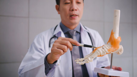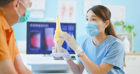 asian female doctor wearing face mask is showing a model of knee joint and explaining to elder senior man patient in hospital