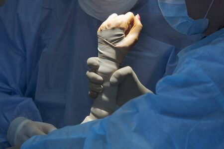 Hospital emergency orthopedics and traumatology surgery operating room medical clinic real life photo in foot, ankle and leg arthroscopy orthopedic operation.