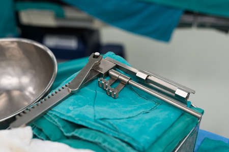 Surgical instruments in the operating room, the surgeons assistant arranges them on a sterile takani. The concept of medecine, surgery, sterile area. Plastic surgery. Selective focus.
