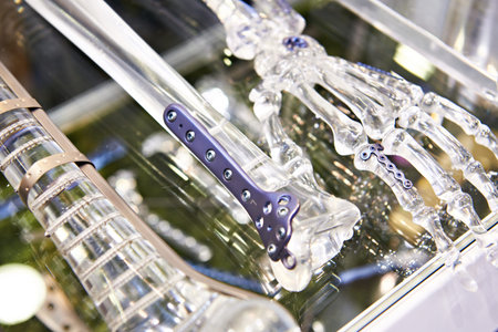Implants and prostheses printed on 3D printer from biocompatible titanium powder. Patient-specific total endoprosthesis of elbow joint for dog on bones printed on 3D printer from plastic