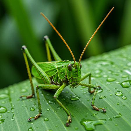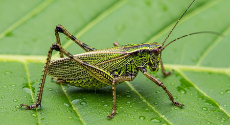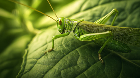 This macro image showcases a vibrant green grasshopper resting on a leaf, emphasizing its intricate details, texture, and sharp features in a natural environment.