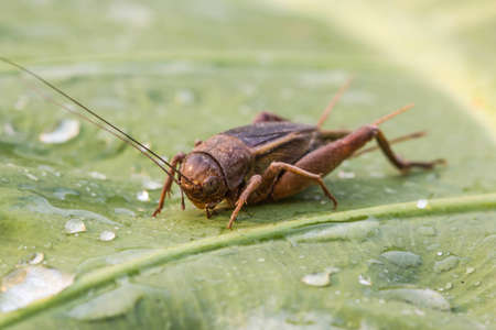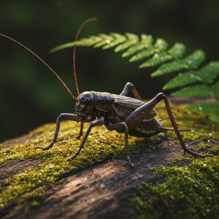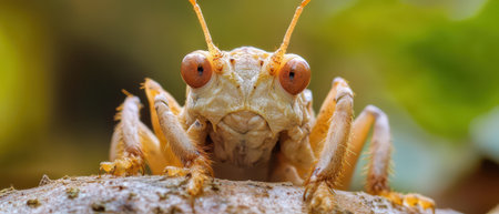 A fascinating close-up of a cricket perched on a branch, showcasing intricate details of its body and environment in stunning macro photography.