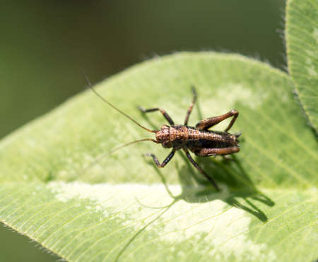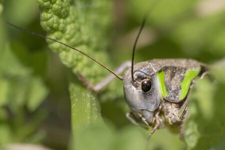 Macrophotography of a Green Mountain Grasshopper (Miramella alpina) on a green leaf. Extremely close-up and details.