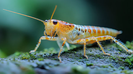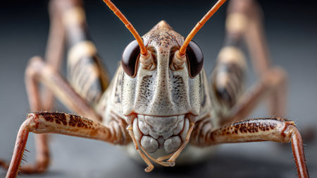 Grasshopper facing forward in extreme close-up. An agile insect with fascinating features, including unique antennae, powerful hind legs, and vibrant coloration. Generative AI