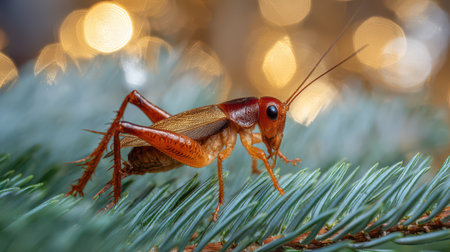 A bright cricket sits on a pine branch surrounded by twinkling lights bringing festive cheer during the New Year holiday season.