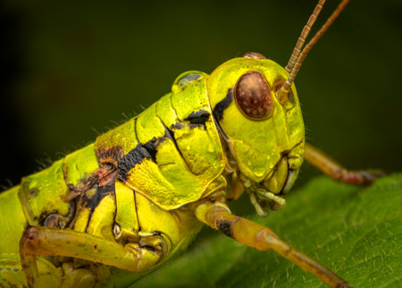This stunning close-up showcases a grasshopper's intricate features and vibrant colors, revealing nature's remarkable details in macro photography.