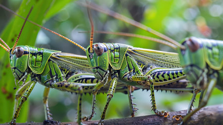 Three Green Grasshoppers: Macro Wildlife Close-up