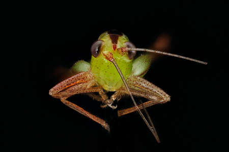 A green grasshopper is depicted in extreme close-up, highlighting its detailed eyes and long antennae against a contrasting dark background, showcasing its natural features.