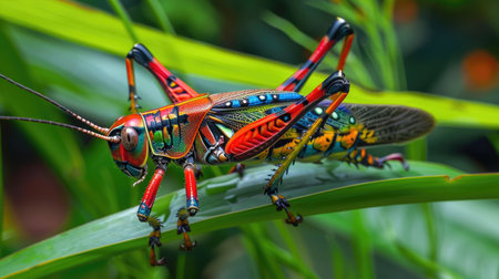 This high-resolution image features a colorful grasshopper, showcasing intricate details and vibrant colors. Perfect for nature enthusiasts and educational purposes.