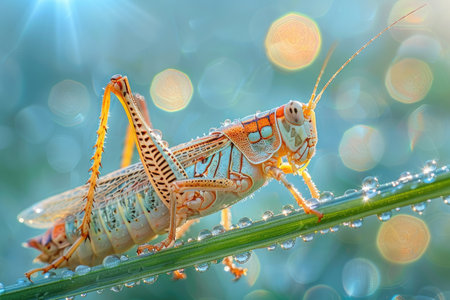 A stunning close-up image of a grasshopper on a blade of grass, revealing intricate textures and vivid colors, capturing the beauty of wildlife in a serene natural setting.