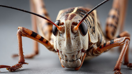 This striking macro photo captures a colorful cricket with intricate details, showcasing its antenna, eyes, and legs against a gray surface. Explore the beauty of nature's tiny creatures.