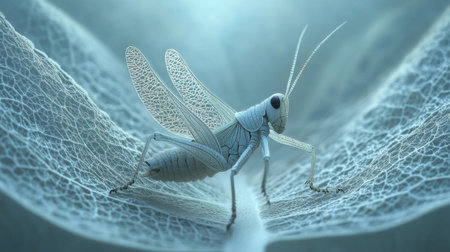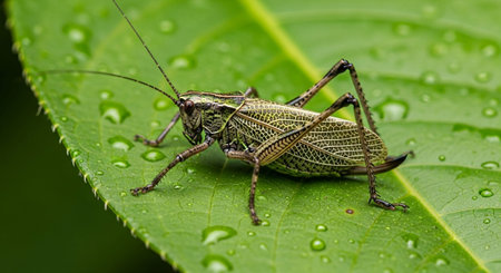 A stunning macro close-up captures a grasshopper resting on a delicate leaf, showcasing intricate details of its anatomy and surroundings in serene colors.