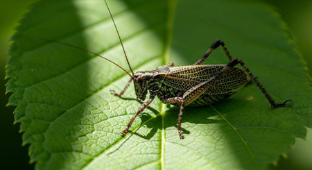 A macro shot of a grasshopper blending into the leaf it is resting on, with its green coloration providing camouflage and the texture of the leaf adding to the detailed image.