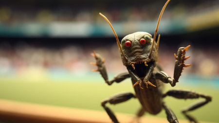 a cricket insect with a fascinating display of various objects in its mouth is captured in this tilt-shift photograph. the image showcases the intricate details of the insect's mouth, while also incorporating elements such as snapshots of iconic hollywood stars, todd mcfarlane's expressive character design, shiny eyes reminiscent of james tissot's art, and a captivating low-angle perspective. ai generated