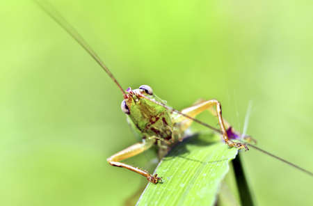 Close up of a grasshopper on a green background. Macro