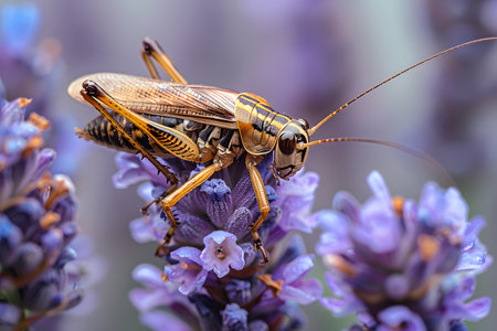 Grasshopper perched on a cluster of blooming lavender flowers in a backyard garden with a blurred background. the detailed macro shot highlights the intricate patterns and vibrant colors of the grasshopper and the delicate petals of the flowers. Generative AI