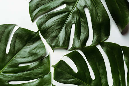 Green leaves on white background. Flat lay, top view. Nature concept.