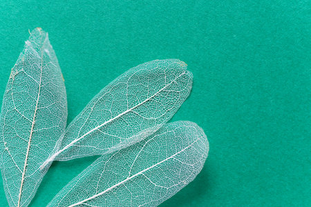 Beautiful skeleton leaves on light green background, macro view. Space for text