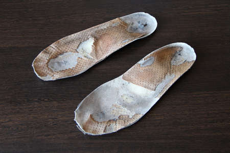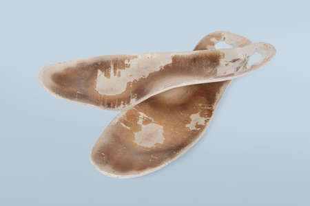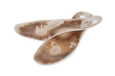Two old, shabby orthopedic insoles isolated on white background. Dirty leather insoles. Worn out things with holes. Inner soles of shoes. Top view banner close up.