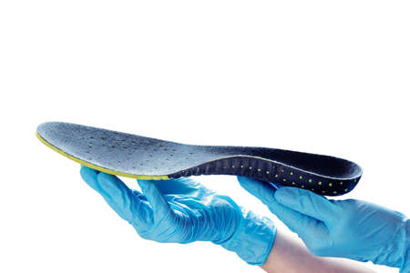 Orthopedic insole isolated on a white background. Hands in rubber gloves hold an orthopedic insole. Foot care, comfort for the feet. Doctor orthopedist tests the medical device. Flat feet correction
