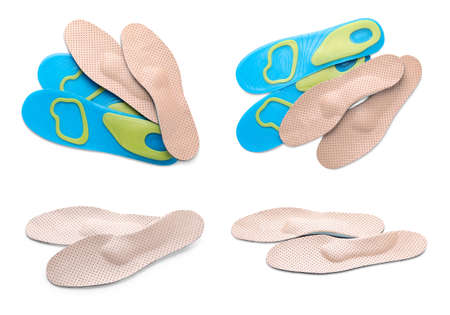 Insoles isolated on a white background. Medical orthopedic insoles. Foot care. Insole cutaway layers. Treatment and prevention of flat feet and foot diseases. Inner soles of shoes.