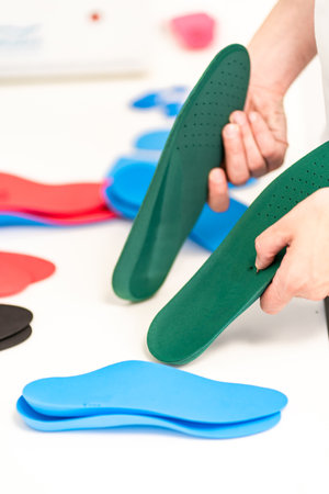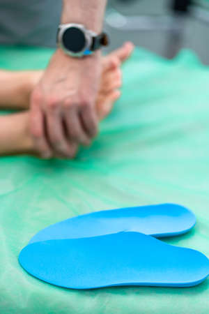 Orthopedic insole. The orthopedist works with the patient. Orthopedic clinic. Choice of insoles in an orthopedic clinic. The orthopedist offers the insole to the patient Foot care