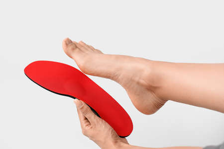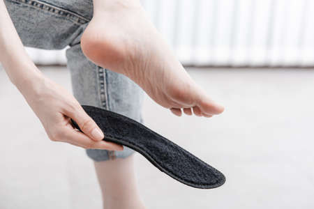 Woman fitting orthopedic insole indoors, close up. Girl holding an insole next to foot at home. Orthopedic insoles. Foot care banner. Flat Feet Correction. Treatment and prevention of foot diseases.