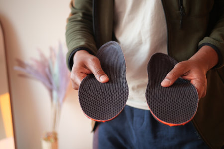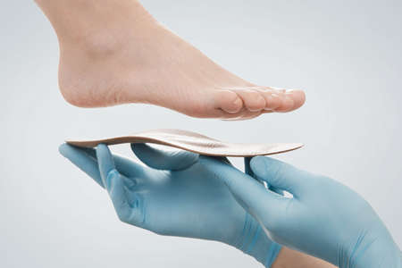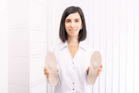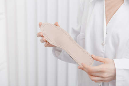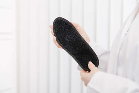 Doctor holding orthopedic insoles in his hands. Orthopedist tests the medical device. Orthopedic insoles on a white. Foot care. Flat Feet Correction. Prevention of flat feet and foot diseases.