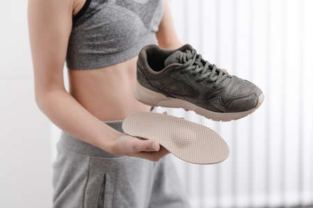Woman putting orthopedic insole into shoe at home. Sports girl fitting orthopedic insole indoors, close up. Foot care banner. Flat Feet Correction. Treatment and prevention of foot diseases.