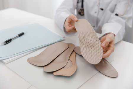Doctor holding an insole while sitting at a table. Orthopedist tests the medical device. Orthopedic insoles. Foot care. Flat Feet Correction. Treatment and prevention of flat feet and foot diseases.