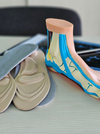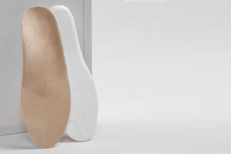 Isolated orthopedic insoles on a white background. Medical insoles. Foot care. Insole cutaway layers. Treatment and prevention of flat feet and foot diseases. Inner soles of shoes.