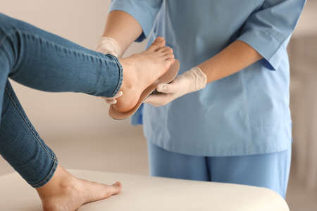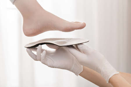 Female orthopedist fitting insole on patient's foot in clinic, closeup