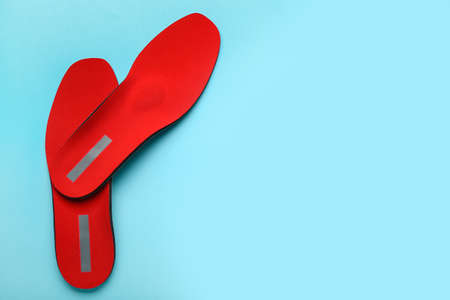 Foot support and healthy feet concept with orthopedic shoe insoles isolated on blue background with copy space
