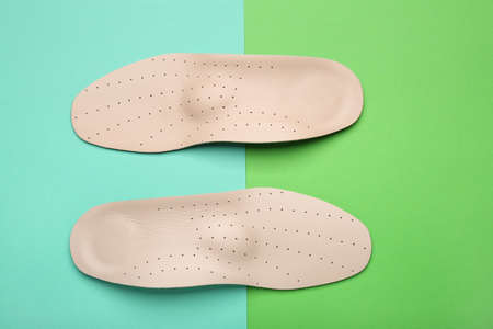 Foot support and healthy feet concept with orthopedic shoe insoles isolated color background