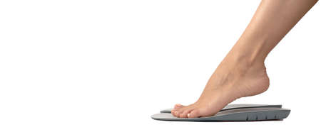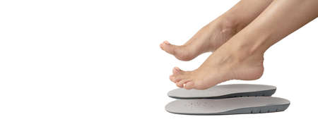 Female legs, orthopedic insoles and sneakers isolated on white background, closeup