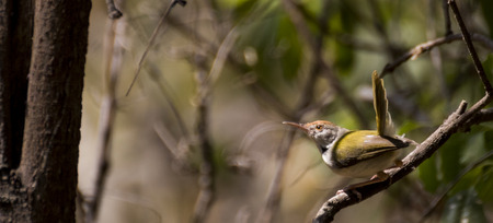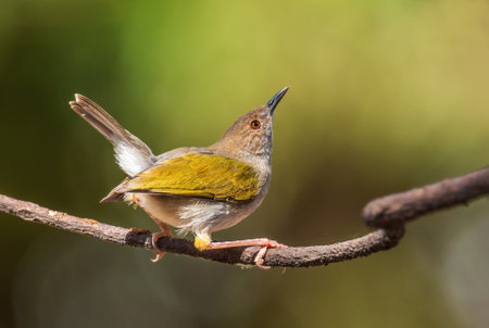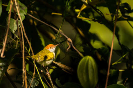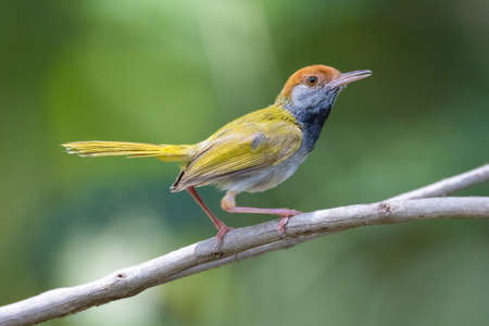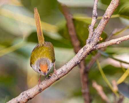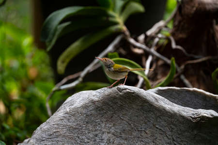 Birding tiny Common Tailorbird or Orthotomus sutorius perching on branch in tropical garden