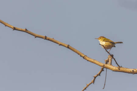 Shot of a Plain Prinia, or the Plain, or White-browed, Wren-Warbler perched on a throne branch in early morning light
