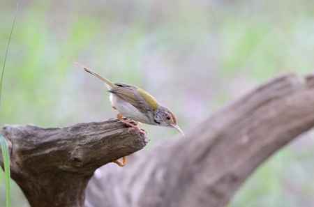 Prinia flaviventris, lovely yellow with grey face and long tail bird lovely standin gon wooden branch expose over green grass