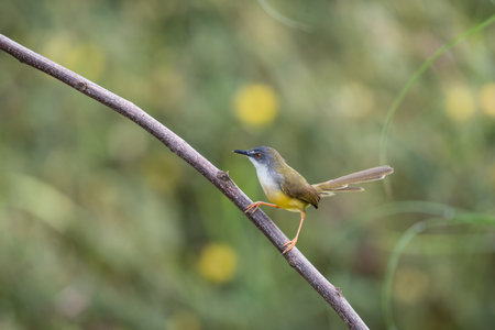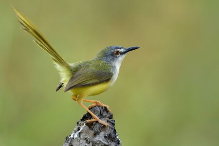 Yellow-bellied prinia (flaviventris) beautiful yellow to grey face bird with long tail lifting while perching on dirt pole over fine green background in nature, exotic wild animal