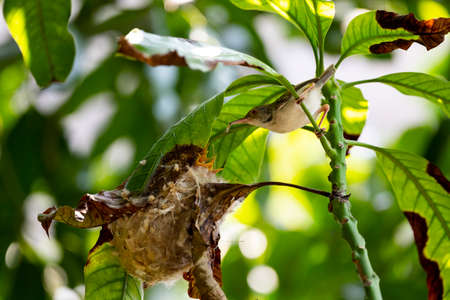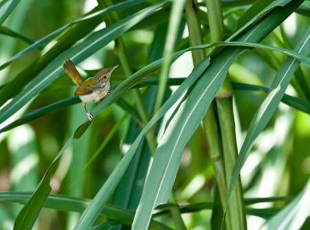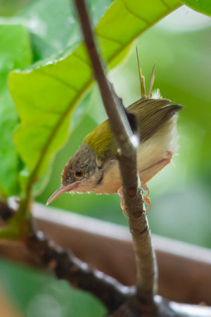 Baby bird Yellow-bellied Prinia or Prinia flaviventris on green leaves in the garden, it is a species of bird in the Cisticolidae family.