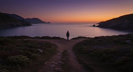 A woman stands on a split path overlooking a coastal bay at sunset, with mountains in the distance.