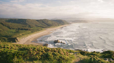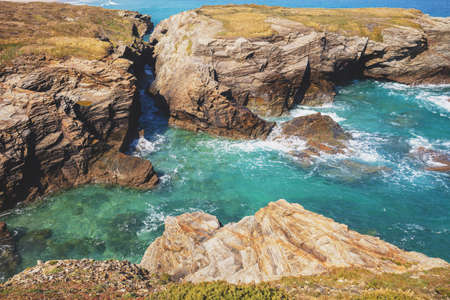 Seascape on a sunny day. Beautiful quiet bay. Rocky sea coast at sunrise. Beach Praia de Augas Santas in Ribadeo. Galicia Spain Europe