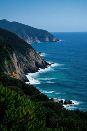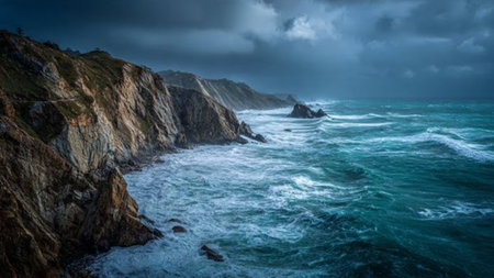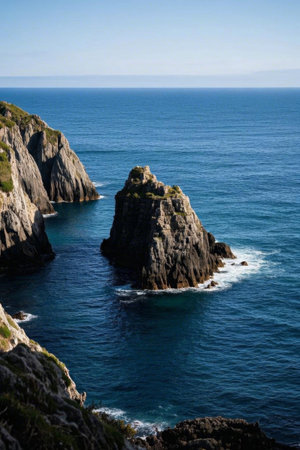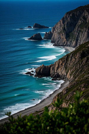 The rugged coastline is a symphony of crashing waves and jagged cliffs, where natures forces collide to create a breathtaking panorama of raw beauty.. AI generated.