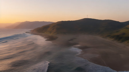 Aerial beautiful shot of a seashore with hills on the background at sunset
