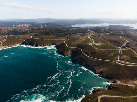 Aerial panorama of renewable enegery windmill wind turbine farm park near Cabo Vilan Costa da Morte coast Galicia Spain