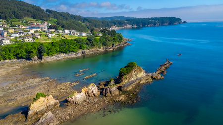 Breathtaking aerial view of Covas beach meeting the turquoise waters of the Cantabrian Sea, with rocky formations and lush greenery, in Viveiro, Galicia, Spain