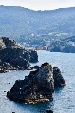 Rocky cliffs landscape at Asturias coast in north Spain. View from Faro de Cabo Busto. Tourist attraction, place to visit.