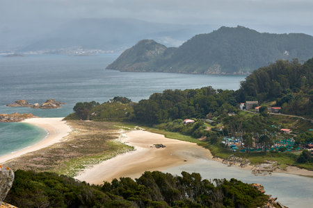 This breathtaking panoramic photograph, taken from the Silla de la Reina viewpoint, captures the stunning beauty of Rodas Beach, the camping area, and the extraordinary landscape of the Cies Islands in Vigo, Galicia, Spain