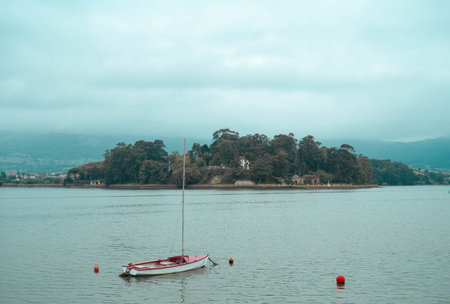SANTONA, SPAIN - JULY 4, 2021: View of colorful fishing boats in the port of Santona, Cantabria, northern Spain, known for its anchovies