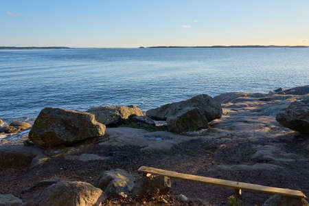 A handmade bench on the stone coast of the Baltic Sea on a sunset.